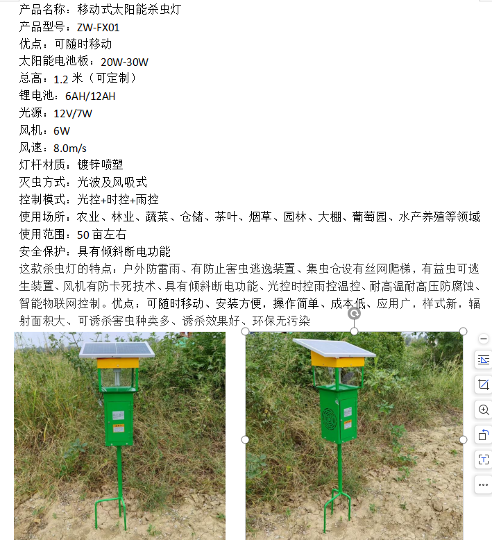 這款殺蟲燈的特點:戶外防雷雨、有防止害蟲逃逸裝置、集蟲倉設有絲網(wǎng)爬梯,有益蟲可逃生裝置、風機有防卡死技術、具有傾斜斷電功能、光控時控雨控溫控、耐高溫耐高壓防腐蝕、智能物聯(lián)網(wǎng)控制。優(yōu)點:可隨時移動、安裝方便,操作簡單、成本低、應用廣,樣式新,輻射面積大、可誘殺害蟲種類多、誘殺效果好、環(huán)保無污染
