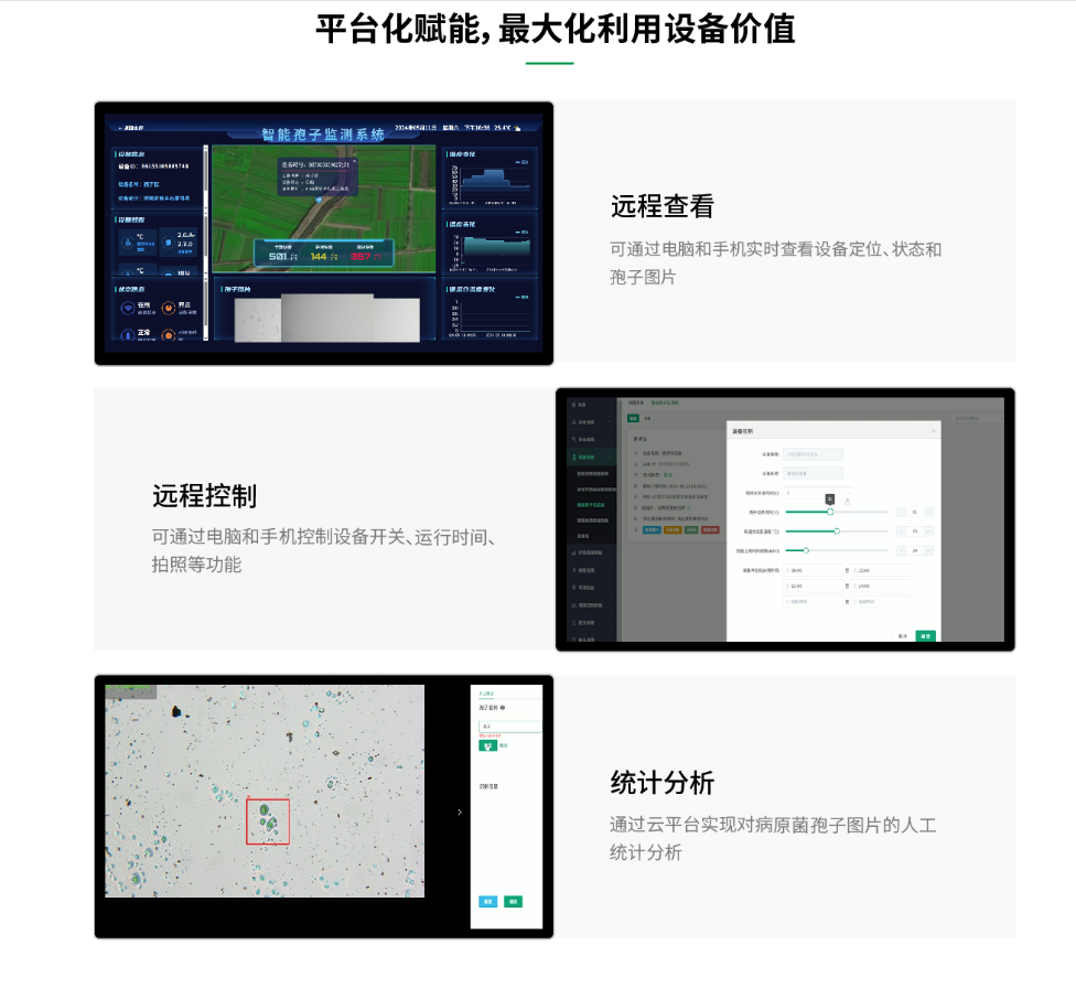 符合GB/T24689.32009植物保護機械孢子捕捉儀(器標準),可檢測隨空氣流動、傳染的病害病原菌孢子及花粉塵粒,設(shè)備內(nèi)含高倍顯微拍照裝置,采用了氣流定量、定時采集、自動加熱、自動培養(yǎng)、自動拍照、無線傳輸?shù)裙δ?,全天候?qū)崟r采集分析病原菌孢子圖像,分析其數(shù)量的變化,預(yù)測病害發(fā)生的時間、程度和傳播路線。實現(xiàn)了病原菌孢子采集的數(shù)字化、自動化,及時預(yù)防農(nóng)業(yè)的發(fā)生和蔓延。